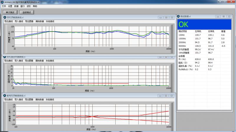 在测试双耳机时,主机输出正弦波扫频信号给双耳机,同时测试双耳机的灵敏度、阻抗和谐波失真,并计算两个耳机灵敏度的差值。在测试麦克风时,主机先压缩测试声源(仿真口)使其在要求的频率范围内输出声级为94 dB,再通过测试声源(仿真口)测试麦克风灵敏度和电流。